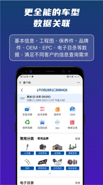 权威数据支撑:提供最具权威性的保养件品牌数据以及OE件分类数据的配置详情