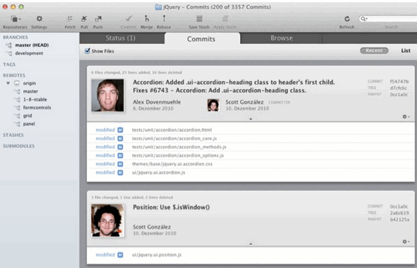 许多强大的拖放和拖放功能包括合并,重订,推/拉向/从远程,应用藏匿处,创建新的分支,等等。