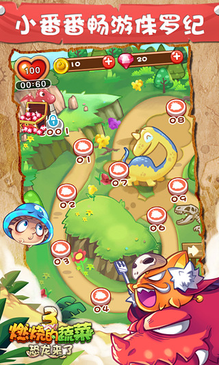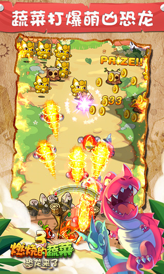 燃烧的蔬菜3游戏画面依旧延续前作的卡通卖萌画风,但不难看出,一部更比一部强的在不断改进。在色彩更加艳丽且饱满的画面中,无论是主角小蔬菜还是小怪兽的Q版设计,都被最大程度的萌化了。燃烧的蔬菜3继承了前作的经典游戏模式和游戏背景,进一步丰富了蔬菜的种类一级怪物类型,与此同时还增加了多种新要素供玩家发掘,可玩性和趣味性都得到极大提升。燃烧的蔬菜3全新引擎带来绚丽画质,蔬菜家族对决萌凶恐龙,前所未见的弹射塔防新玩法,蔬菜农场缺啥种啥,Fever燃烧模式爽快爆棚。这个夏天最萌爆游戏,加入蔬菜3战队,让我们一起打怪兽吧!