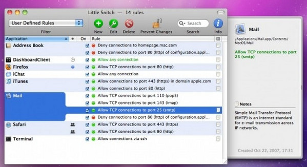 Little Snitch允许你拦截这些多余的连接尝试,并让你决定如何进行。Little Snitch通知您,当一个程序试图建立一个传出的互联网连接。然后,您可以选择允许或拒绝就此,或定义一个规则如何处理类似的,未来的连接尝试。这可靠地防止在您不知情的情况下被送到私人数据。不显眼的小飞贼运行在后台,它也可以检测网络病毒,木马和其他恶意软件的相关活动。
