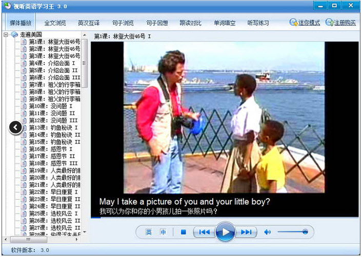 想找一款能看能听的英语学习软件不容易,《视听英语学习王》是一款非常实用、有效的视听英语学习软件,它精选了视频教材《走遍美国》、《纵横美国》、《老友记》、《新概念英语》(含全套四册动画视频)、《英语900句》视频版和口语听力教材《英语900句》、《英语口语8000句》、《商务英语900句》、《出国实用会话》、《常用英语会话》、《雅思口语》《轻松美语会话》、《疯狂英语》等常用教材,共计三万二千多句,所有句子均采用真人语音朗读,并配以中文译文,通过全文朗读、句子即指即读、录音对比、句子听写等实用的软件功能,帮助您迅速提高英语口语和听力水平。