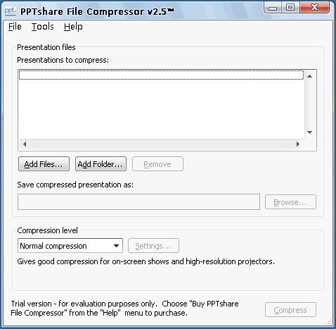 PPTshare File Compressor是一款Power Point文件瘦身工具。它最大可以将文件减至原始大小的5%