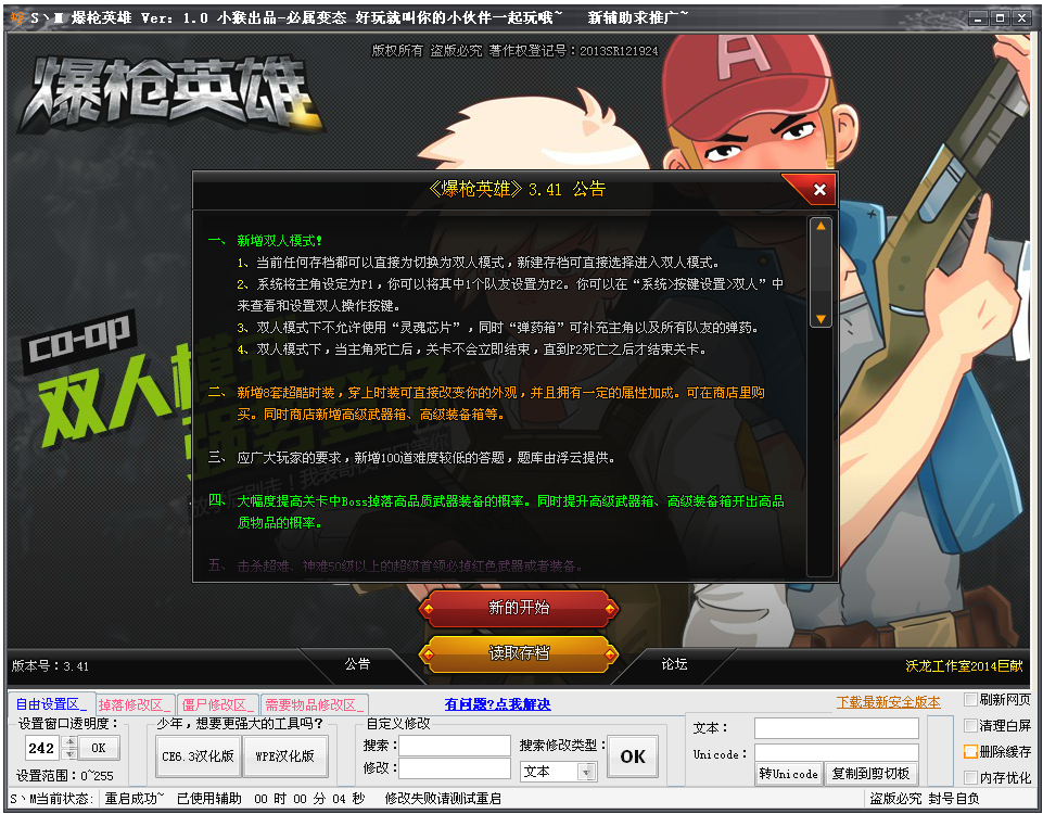 自由设置区:设置窗口透明度、CE修改器、自定义修改掉落修改区:银币狂暴、弹药狂暴、血瓶狂暴、基因体必爆