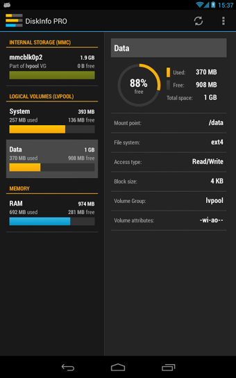 DiskInfo PRO v4.5.2 安卓版 DiskInfo手机版是一款小巧且功能简单的软件,它的作用就是能比较方便的查看手机的存储信息。DiskInfo PRO让你更加了解手机内文件和数据的存储情况,以及软件占用的空间,用起来很顺手。