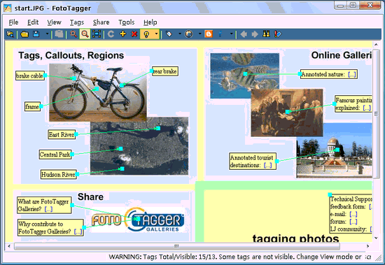 FotoTagger V2.11 英文绿色免费版 FotoTagger 是一款免费的照片注释软件。它可以在照片上添加可以动的便于隐藏的文字信息,记录拍摄照片的日期或者照片内容介绍。该软件可以直接将注释过的照片张贴在Blogger.com和 LiveJournal上用户的网络日志中。只支持JPEG文件