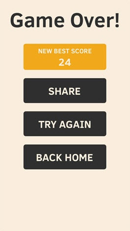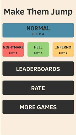 从界面上来看,Make Them Jump沿袭了2048式的简约风格,整个菜单只有游戏模式、排行榜、评分以及更多游戏的连接,当然,作为休闲游戏,简洁的界面更容易吸引玩家。游戏的核心思想和Flappy Bird是高度相似的,你需要的唯一动作就是控制小人跳起越过障碍,而它最绝的地方,还是在于难度叠加上:借助多点触摸,游戏提供了四个难度,每提高一级,屏幕上就多一个需要控制的小人,所有小人的操控互相独立,最高难度下同时控制5个小人跳跃已经显得相当反人类。