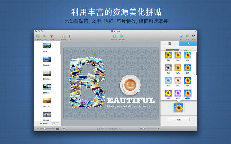 1、拼贴精灵3免费版是一款使用简单,让用户在Mac OS X系统下自动生成漂亮的照片拼贴的拼图制作应用程序. 它让每个人都能够组合美化自己的照片集. 只需短短几秒,一整批照片就能变成一系列令人惊叹的拼贴.2、使用拼贴精灵3免费版,制作照片拼贴毫不费力。