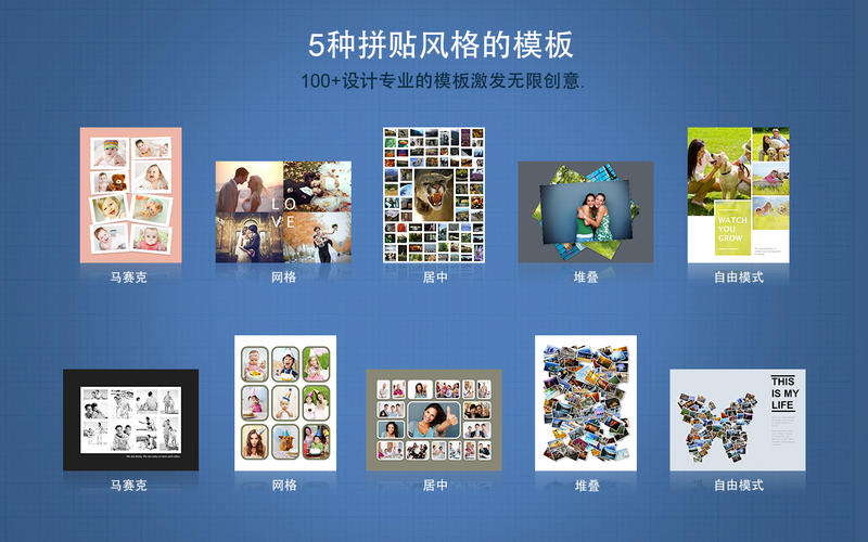 3、在四种拼贴风格- 马赛克, 网格, 居中, 堆叠(包括45+全新模板)中选择一个模板, 添加照片和文字, 就能自动生成照片拼贴.