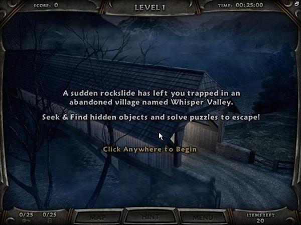 低语谷逃亡中包括了3种游戏模式,带有故事情节的山谷逃亡模式,无时间限制的探索发现模式,以及神秘奖励游戏。在25个神秘而迷人的场景中找出2100种以上隐藏物体,才能够顺利离开这里。