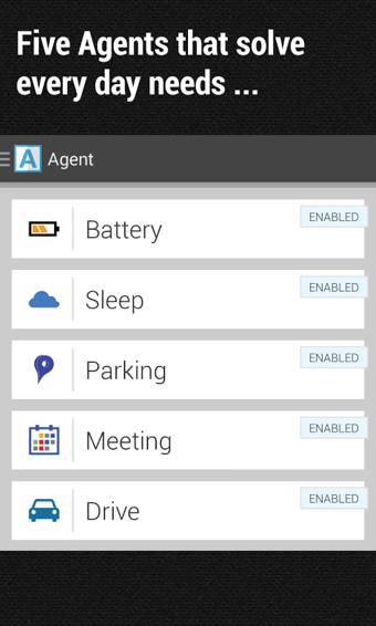 Agent 智能情景模式可以做到:电池快没电时自动开启省电、睡觉时自动开启勿扰模式、开会时自动关静音、停车时自动记住停车位置、开车时开启手机自动接通模式。Agent智能情景模式应该说最大的特点就是傻瓜化,内置了几个模式直接就可以使用,如果你想细微调节下也行,总之就是够用,不需要浪费时间去设置各种参数。
