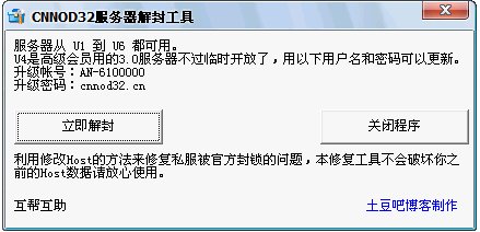 CNNOD32服务器解封工具 1.0 绿色免费版 哈哈原本不是我要做的事,看着用私服的网友急得像热锅上的蚂蚁,写个出来让大家用用吧,修复方法是利用了CNNOD32的手动修改方法,一键全模拟操作,不破坏之前HOST内容,放心使用!