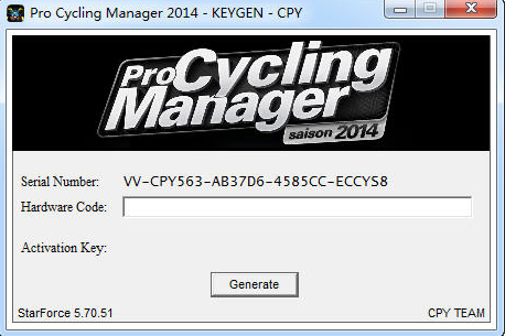 《职业自行车队经理2014》是全球最顶级的自行车赛事,玩家将积极组织和参加各类赛事的比赛,不断的招募高技术水准的队员,管理好自己的团队,该补丁为游戏的CDkey生成器。
