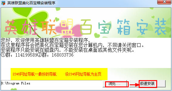 运行英雄联盟美化百宝箱安装程序——“浏览”到安装目录(可选择任意安装路径)——点击“极速安装”,如下图