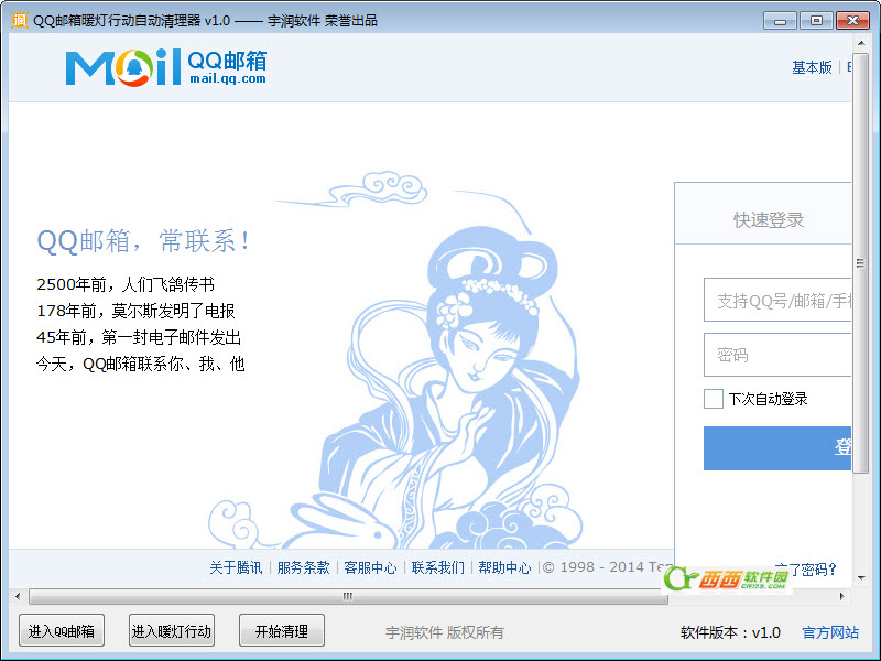 QQ邮箱暖灯行动清理精灵 V1.0 绿色版 QQ邮箱联手腾讯公益、中国绿化基金会,发起“最亮的明天”暖灯行动,清理你不再需要的旧邮件,我们将捐助贫困地区的学校改善照明设备。现在只要我动动手指删除一定量的旧邮件就能帮助到那些孩子们~ 全体QQ邮箱用户删除到达150T容量的垃圾旧邮件,腾讯就会捐赠40万给那些偏远山区的学校,改善他们的照明条件,减轻国家负担。