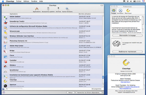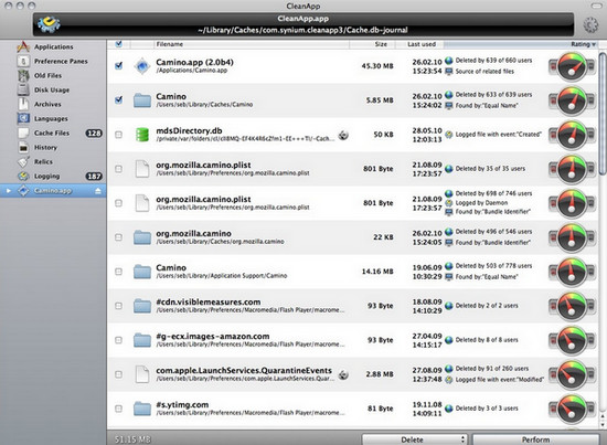 CleanApp的用户界面简单易用,它会列出所有在硬盘中的应用程序,只要将不再需要的程序拖放到视窗或 Dashboard中的CleanApp widget便可。同时,可将应用程序、系统外挂程序、widgets、插件程序等相关文件建立成压缩的存档。