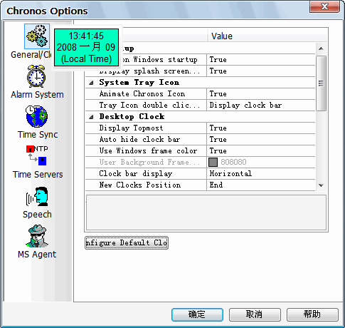 Chronos Clock 这套桌面时钟能够显示多个时钟和不同时区的时间,是一套非常容易安装与使用的桌面时钟。假如您需要知道某个国家的时间,您可以很快地设定时钟,显示出该区的时间,Chronos也会计算出夏令节约时间与标准时间的变化。Chronos Clock包括下列功能:多个时钟同时显示不同地区的时间、闹钟控制功能、设定多个或重复性的闹钟时间,每段闹钟开启时间除了会有闹钟声响,还可显示提醒讯息或是执行另一个程式,您可依照自己需求设定各种指令,此外,还有月历/记事本,能随时提醒您注意任何重要日期或约会,还有网际网路同步时间功能,让您的电脑时间能自行对时