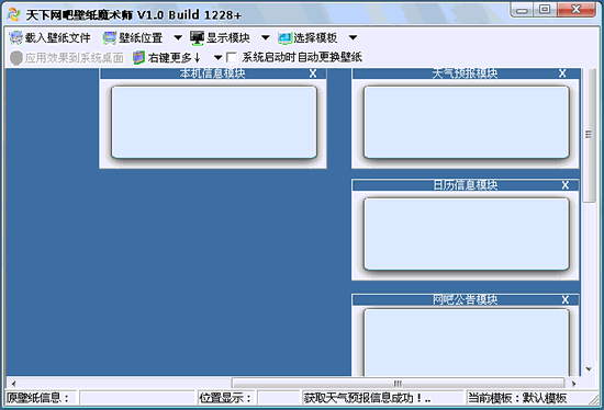 全免费,纯绿色,无插件。无广告。可以将壁纸合成加工成带有天气预报,带有本机信息,带有公告还有日历信息的透明效果的壁纸,非常漂亮,使用方便