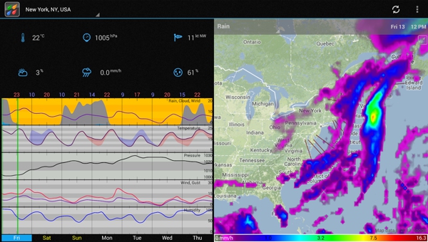 WeatherBomb是一款专业气象信息查看软件,可以查看详细的天气信息,包括温度、降水量、风速、云量等,数据源是 NOAA(美国国家海洋和大气管理局)。地图视图到7天的数据给出平滑滚动。图形视图给出了周雨,风和云的预测一目了然。预测数据包括雨,风,云,温度,压力和湿度的波高(为渔民和冲浪)。