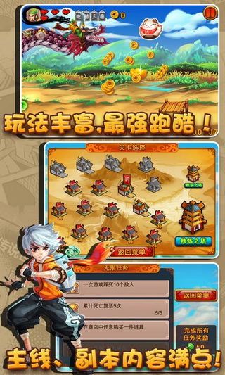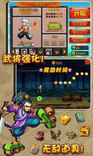 由大连赤犬82开发的这款《跑酷三国》是以一个现代少年(程序员)一次穿越旅途为故事背景的三国题材跑酷游戏。虽然三国游戏市面上繁多,但像这么搞怪另类的动作游戏则并不多见,游戏中我们可以看到骑着黑龙的关云长,驾驶着机器鸟的曹操,骑着红色大兔子(赤兔- -!)的人中吕布,还有花蝴蝶一样的貂蝉等等传奇人物以个性有趣的方式出现在玩家面前!