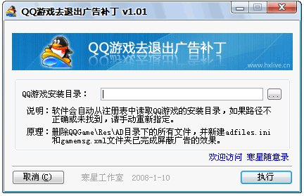QQ游戏去退出广告补丁 V1.10 绿色免费版 此补丁程序其实也没有什么技术含量,做这个小玩意的目的就是为了方便,在退出QQ游戏时,不再出现烦人的广告。其实原理也很简单,就是:删除QQGame\Res\AD目录下的所有文件,并新建adfiles.ini和gamemsg.xml文件夹已完成屏蔽广告的效果。