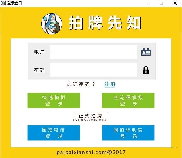 拍牌先知界面有两种模拟共选择,快速模拟(只有第二阶段),全流程模拟(和正式拍牌一样从输入账号到结束:主要全流程模拟需要输入账号是,随意输入任何投标号八位数和任意密码就能登入)【软件特点】