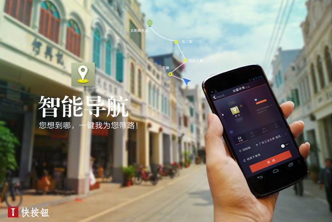 快按钮能够赋予手机一个物理智能按键,从根本上的完成人机交互方式的优化,所想即所得,简单直接,快捷智能。快按钮依据中国用户的使用习惯,为用户量身打造了10余种快捷功能。用户可以通过快按钮应用程序将预设手势与常用手机功能一一匹配,让用户彻底摆脱唤醒手机-->给手机解锁-->再找到相应的应用-->点击打开应用-->寻找到你需要的功能这个复杂的流程,即使在锁屏状态下,也能一键快速启动功能,满足您的快捷体验,带给你全新的人机交互体验。