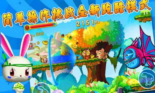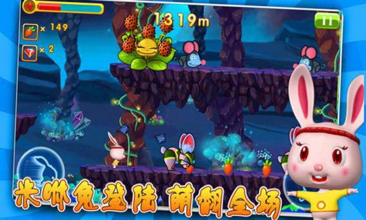 沿路上兔子会遇到各种各样的障碍,除了一些物品障碍之外,看似可爱的小动物也都是阻碍兔子前行的障碍,千万别以为它们是兔子的好伙伴,更可恶的是,这些小动物还会发射出一些道具来伤害小兔子,所以躲避一定要及时,屏幕上方显示着兔兔的体力值,而吃到心爱的萝卜是补充体力的不二法则。