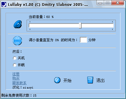 Lullaby V1.0 汉化绿色特别版 一款音量操作辅助软件,当你打算边看电影或者边听音乐边睡觉时,他会按设定好的时间渐渐减小音量直至静音,然后将电脑休眠或者关闭,免除了你从被窝里爬出来关电脑的痛苦。