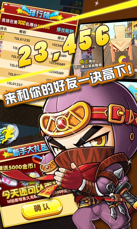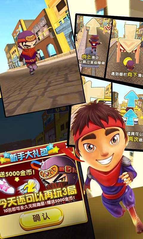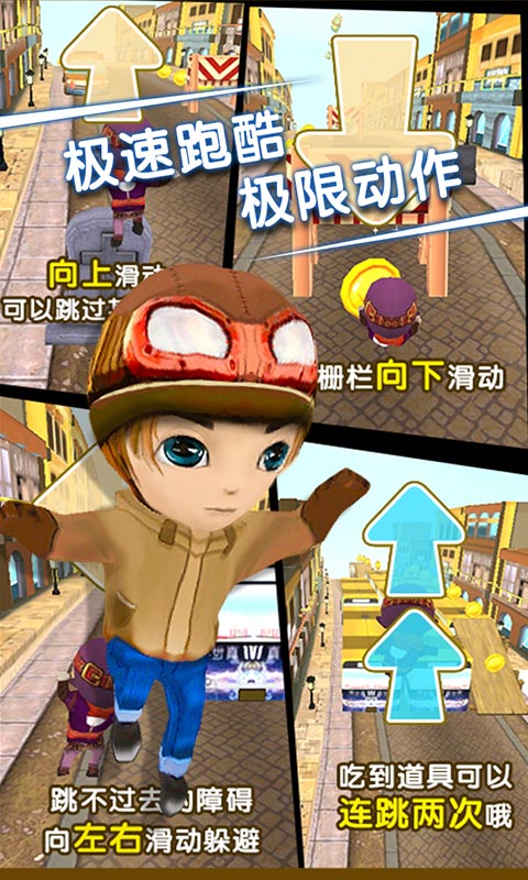 《穿越小镇》是一款全新3D西部异域风情的跑酷竞技类游戏,操作超级简单,滑动屏幕实现跳跃下滑和左右闪躲,躲避障碍,捡取越多的金币和道具就能获得越高的分数,玩家可以通过控制主角大雄,静香,卡卡东和国足狗来冲破一切障碍,急速狂奔欣赏路边风景,还有磁铁、得分翻倍等道具让你畅快游戏。想知道还需跑多少次才能绕地球一圈吗?答案就在转角处等你呦,快来跟我们一起穿越小镇吧!