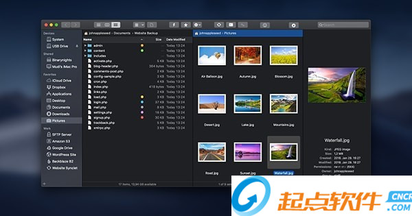 双窗口也让本地和远程之间的文件管理、同步更方便。还可以将站点添加到左侧收藏夹,下次再访问直接点击即可。除了 FTP,ForkLift 也支持 Amazon S3 等多种文件传输协议。