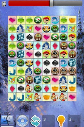 重排,可重新排列图标;提示,提示两个可消除的图案,如果没有可消除的自动重排;时间,增加10秒时间。