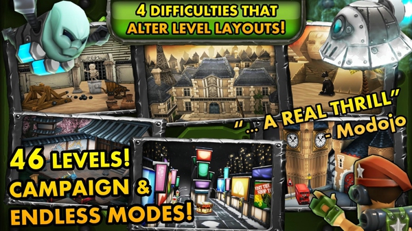 《指挥官杰克 Commando Jack》是一款独特的塔防游戏,指挥官杰克结合了传统放置式塔防和第一人称射击的特点,在世界各大城市地图中率领你的精英小队抗击外星人入侵。玩家一面要根据场景地形安放防御塔,使敌人进入我方预先设计好的路线,一面又要随时切换到主炮台视角,及时打击重型装甲敌人和BOSS,还有对方派出的狙击手。游戏的关卡模式并不像其他塔防类游戏那样按部就班,玩家可以在世界地图上选择不同的城市进入战斗,每一场战斗都有三个档次的难度,分别是简单、普通和困难。地图也有解锁要求,不过条件比较简单,很容易达成。游戏整体内容丰富,战斗紧张激烈,定会让你爱不释。