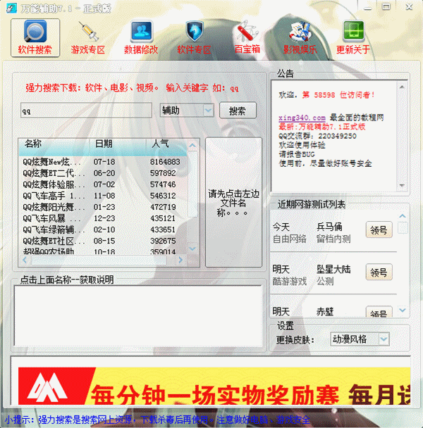 网游万能辅助不仅仅提供游戏脚本的制作,它还是一个集娱乐休闲为一体的综合性小软件,为玩家提供看电影、小说、领取新手卡、内置答题、杀毒软件、工具箱、在线网络电视等多种功能。