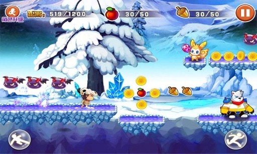 玩家控制可爱的原始人穿越森林、冰川等各种险境,不停奔跑、跳跃、滑行躲避各种障碍物,同时收集金币及苹果、松果、冰鱼、雪莲等道具,以达成每个关卡的任务。