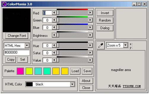 Color Mania是一个非常不错的屏幕取色软件.软件体积也相对比较小,操作方便、简单易用,很直观,允许你从你的桌面上的任何地方选取颜色,然后拷贝该十六进制(HTML, Delphi, VB, C++) 或者RGB 值到剪贴板。该软件配以一个小型的浏览器,让你可以在你背景颜色上选择一个彩色的字体并且随意地修改该颜色并且采用5种喜爱的颜色之一将其保存。此外,你可以设置放大倍数以及生成随机颜色和反转颜色。