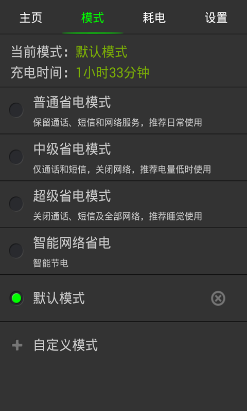 选择省电模式:通过选择或自定义省电模式,来延续电量的使用时间;提供普通、中级、超级三个等级的一般省电模式和智能网络省电模式,用户还可自定义省电模式。