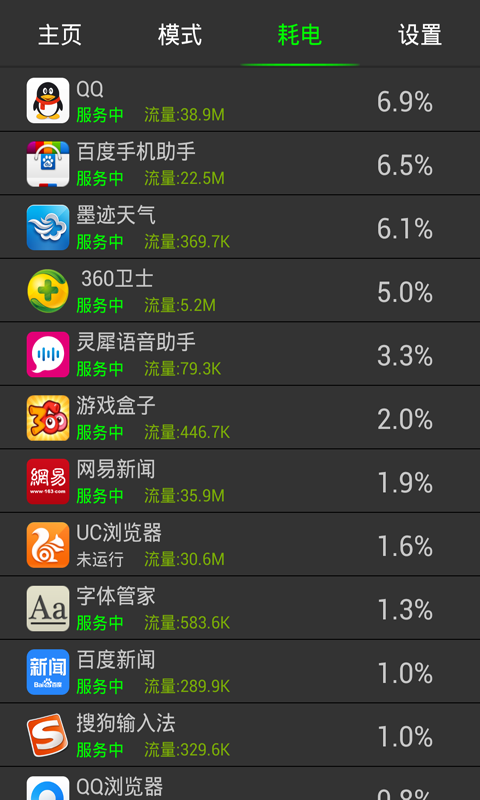 耗电应用统计:可一览手机中所有应用的电量消耗百分比、流量耗费情况。