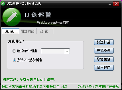2、选择免疫的目标,可以选择所有本地驱动器,也可以选择指定的盘,比如U盘。点击“开始免疫”即可在磁盘上建立免疫的目录,此后免疫过的U盘拿到其它电脑,即使把自动运行的病毒拷入,也无法激活运行。如果想删除免疫的目录,请在工具中选择取消免疫;