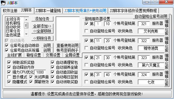 1.主线任务说明如果该功能被选择,建议勾选一键登陆设置里面的全智能创建帐号,一键全自动无需注册或编辑任何帐号,JJ全自动注册的帐号都自动保存在C盘"帐号.ini"文本里面,已完成帐号则保存在 例如登陆的是888区,就保存在C盘的"第888区已完成帐号"文本里面,20开为例子,一天一般可完成1000个68级以上的帐号,这些帐号可用来以后刷每天日常