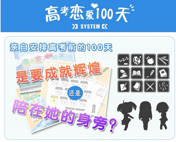 高考恋爱一百天以“高考”为切入点,展现高考前一百天的高三生活,玩家对主角的培养会对其高考成绩产生影响,并影响到结局。因为完结不同选择,剧情上产生的各种感情纠葛,和女友之间飘忽不定的关系,还有家长和学校的反映以及身边环境造成的各种压力,都是游戏的特色。五十多种不同的结局,也会让玩家体会到人生的多变,经历磨难后的真正完美结局也能让玩家体会到真挚感情的宝贵。
