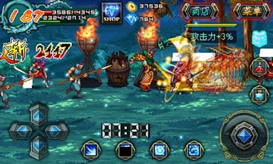 雄霸三国操作简单,主角可以控制主角不断的击败敌人获得经验值升级, 同时可以捡取敌人身上的财物来购买各种装备以及升级装备, 再获得好的装备后可以继续挑战高难度关卡以及挑战关卡, 既有街机的爽快感节,又有游戏丰富的可玩性。