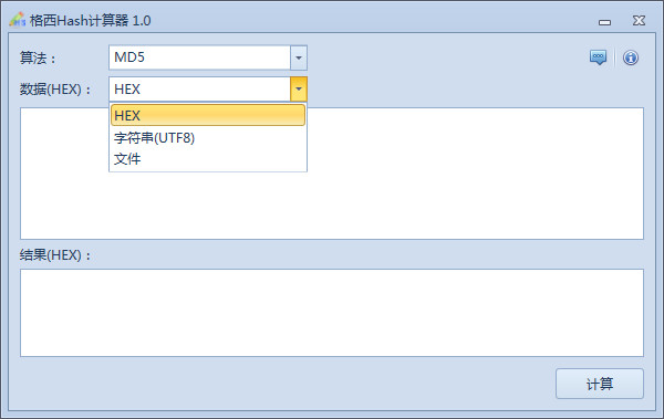 计算的数据源可以是HEX数据字符串、字符串(UTF8,即计算时将字符串转为UTF8格式进行计算)以及文件。