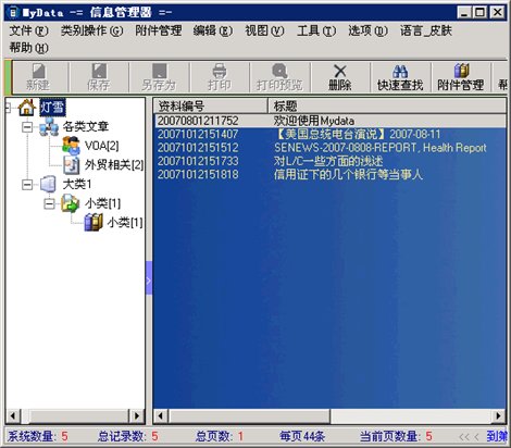 > Mydata(资料管理器) 就是为解决这两个问题所开发的,通过把一个文档进行二级分类标识同时存放于数据库中,并且可以添加任意类型的文件作为附件.这样处理后查找可以成倍的提高速度,可以按标题\关键字,甚至全文进行查找。