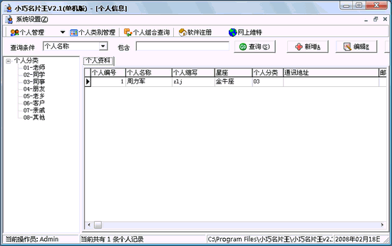 小巧名片管理系统 V2.1 绿色特别版 名片本身是联系信息,各种各样的联系信息毫无疑问是您非常宝贵的无形资产.小巧名片管理系统主要是为了管理您长期积累下来的众多名片而设计,当然也可以用来管理您的其他联系信息.