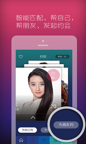 “约你”是全球首创的场景式移动交友O2O应用,是微信公众号“约你妹”推出的原生APP,满足了从陌生人到熟人的线上交友,线下约会的需求。约你妹自问世以来一跃成为交友类应用热门新贵。“为朋友约”的功能,作为应用的亮点贯穿主线,突破邀约的社交障碍,帮助用户从线上认识到线下约会场所选择一步到位,让约会聚会变得更加简单轻松。约你提供了微信没有的线下安全约会场景。“约你”--相见不恨晚,我们约会吧!