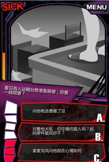 游戏玩法十分简单,你只要根据问题选择出最接近自己的答案就可以,当你答完题目之后,游戏将给你一份检验报告。但要从三个答案中选出一个符合自己的答案也是有一定难度的,因为你常常会发现三个答案都不是你心目中的答案,这些答案可能会非常奇葩。于是,你的思维将从一开始测试的正常思维到后来的不正常思维再到最后的奇葩思维。
