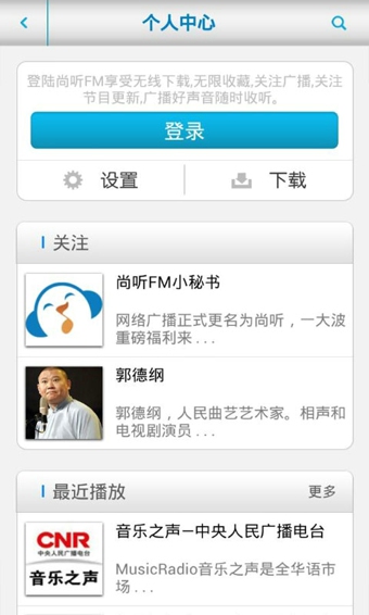 尚听FM,致力于打造最完美的收听体验。想足不出户知晓天下事?想使一个人的时光不再枯燥无聊?想用最轻松愉快的方式增长知识见闻?“尚听FM”帮助您解决一切问题!国内外海量直播电台全收录,新闻、笑话、访谈、有声小说等十七种节目类型任你选择,清新明亮的界面设计,优质悦耳的播放效果,让你的耳朵享受快乐。“尚听”让你爱上听。【更新日志】