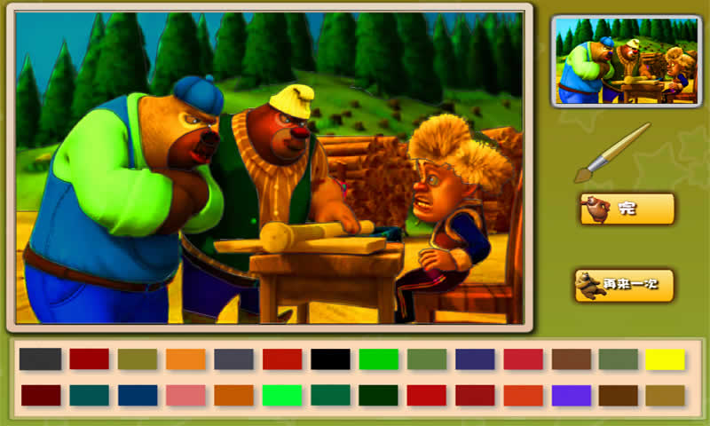 《熊出没涂鸦》是一个非常有意思的游戏,它不是简单的填颜色,而是可以培养小盆友们对颜色的搭配是否有天赋,小盆友往往是不按规矩配色的,在小盆友的世界可能每一种颜色都有另一种蕴意,当然了,如果能还原成与左下角一模一样的图,那也算是一个很厉害的颜色大师咯!