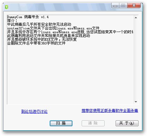 该程序运行后关闭并阻止360安全卫士和卡巴、瑞星、金山、江民等大家所熟知的安全类软件的运行,除此之外还会删除系统中含有“360”字样的文件。感染病毒后,进程中会多出smss.exe和lsass.exe进程,使用任务管理器结束后会造成计算机重启。