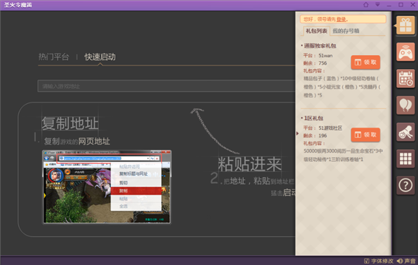 玩家可以将某个平台的圣火令游戏登陆地址粘贴到本工具中的游戏地址框内,再按启动游戏即会跳出游戏登陆界面